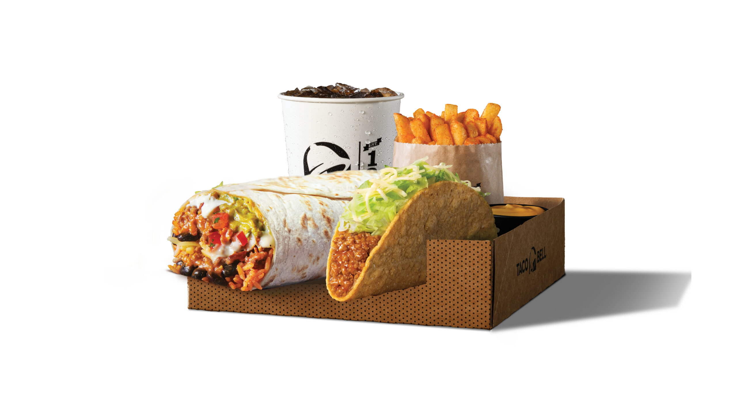 Can’t choose between a burrito and taco? We have you covered! The Boss Burrito Box comes with a Boss Burrito, Crunchy Taco, Nacho Cheese Sauce and your choice of Chips & Soft Drink